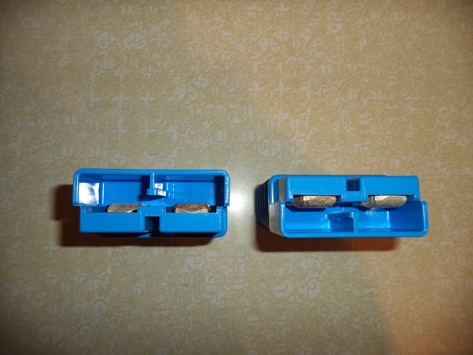 Picture DSC0694 showing the Total Source SY6321G1 Connector Kit Blue SB350 2/0 Awg 2/0 high power disconnect plug. (Ebay at $20.00 each). Two identical plugs mate as a pair.