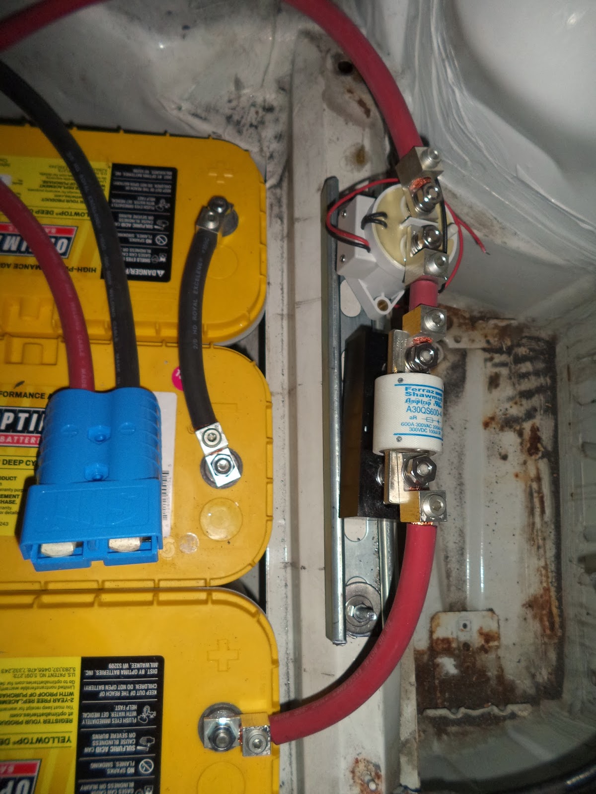 Picture DSC00709 showing a single 600 Amp Ferraz Shawmut A30QS600-4 fuse installed in series with a Kilovac Czonka III Relay during the preliminary installation when only the positive battery terminal was fused.
